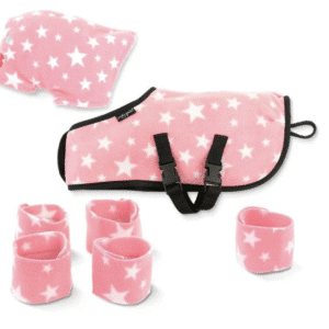 ย ย ย The Crafty Ponies Snuggle Rug Set will help keep your Crafty Ponies snuggly warm and cosy on cold winter nights!ย ย Notย based a on “real” pony set, this is a fun set especially made for children to “dress up” their Crafty Ponies and play with.ย There is a fleece rug with cross surcingles, front Velcro fastening and tail strap, a head and neck cover and four leg wraps with Velcro fastenings.