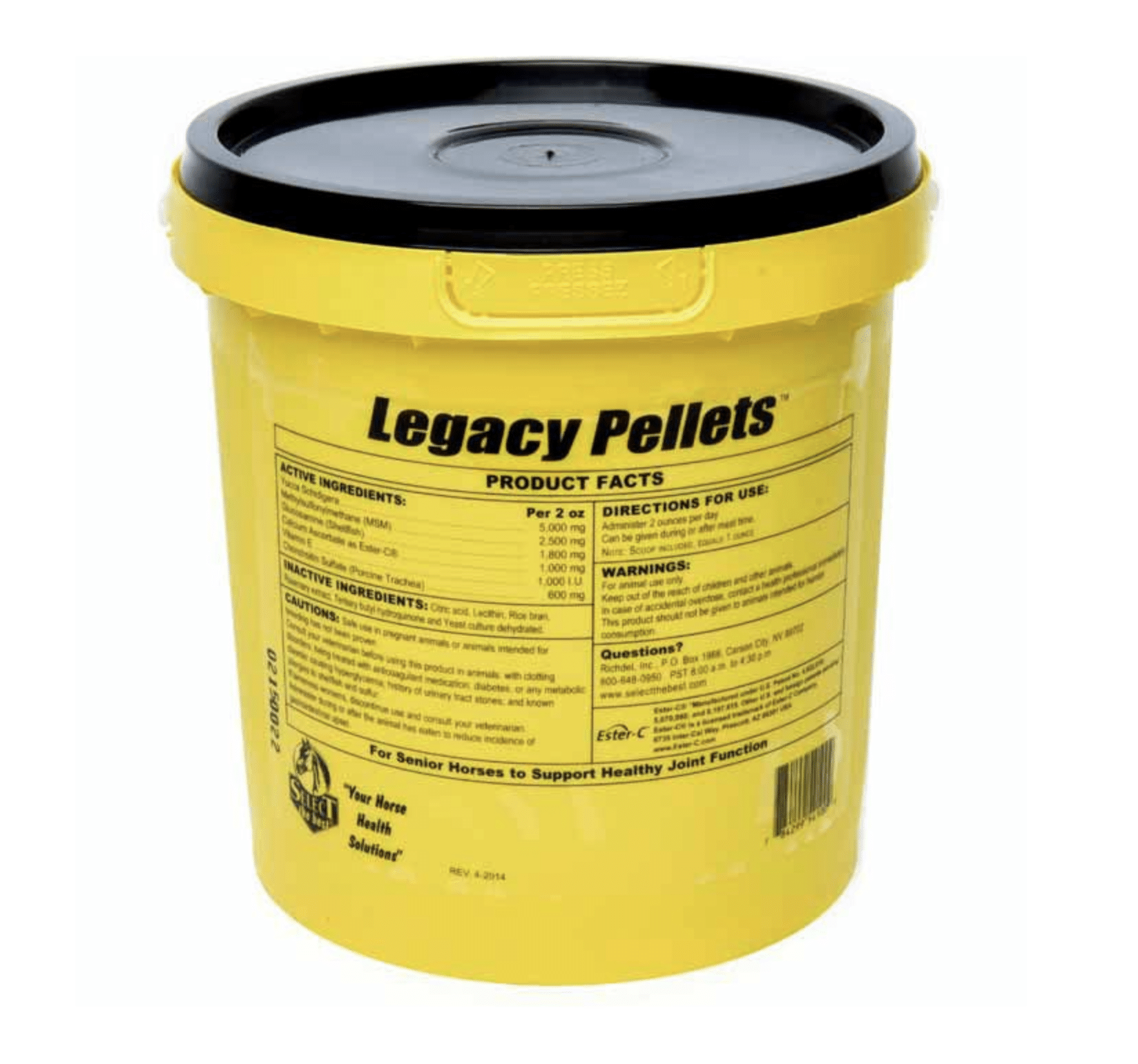 Legacy Pellets Senior Horse Joint Supplement is a nutritional supplement specifically designed for senior horses. The senior horse supplements feature compounds proven to enhance and strengthen the joints, connective tissue and soft tissue. These horse supplements also include glucosamine and chondroitin sulfate for added nutrition. The pelleted form of this horse supplement makes it easy to feed and digest.