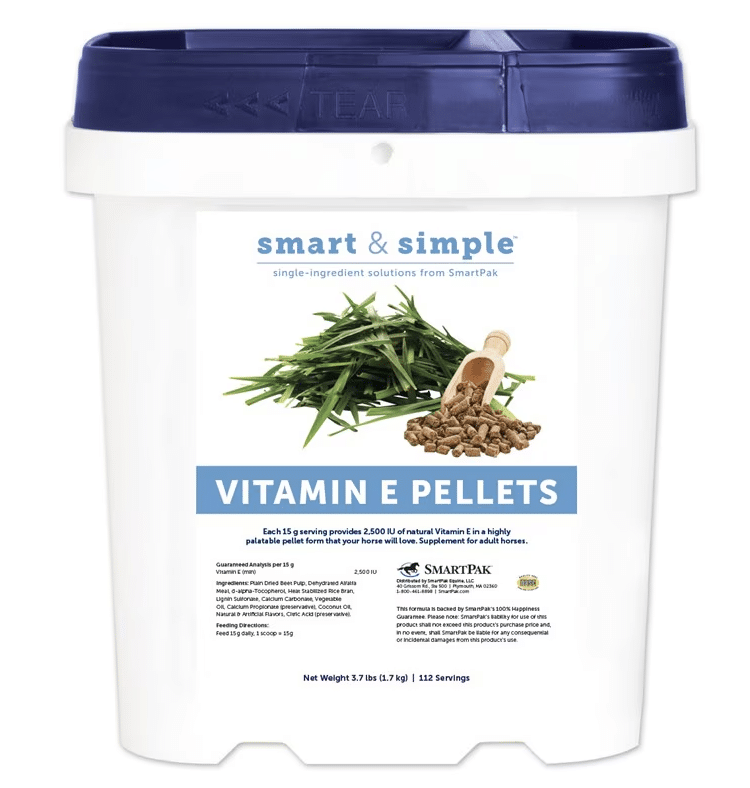 Vitamin E is a powerful antioxidant that helps neutralize free radicals, the damaging by-products of normal cellular activity. While this important nutrient is found naturally in fresh grass, levels begin to drop the moment grass is cut for hay. Horses without access to pasture, as well those in heavy work or under stress, should receive supplemental vitamin E. Research shows natural vitamin E may be the most effective form. Smart & Simple® Vitamin E Pellets provide your horse with 2,500 IUs of natural vitamin E (d-Alpha Tocopherol) in a tasty pellet your horse is sure to love!