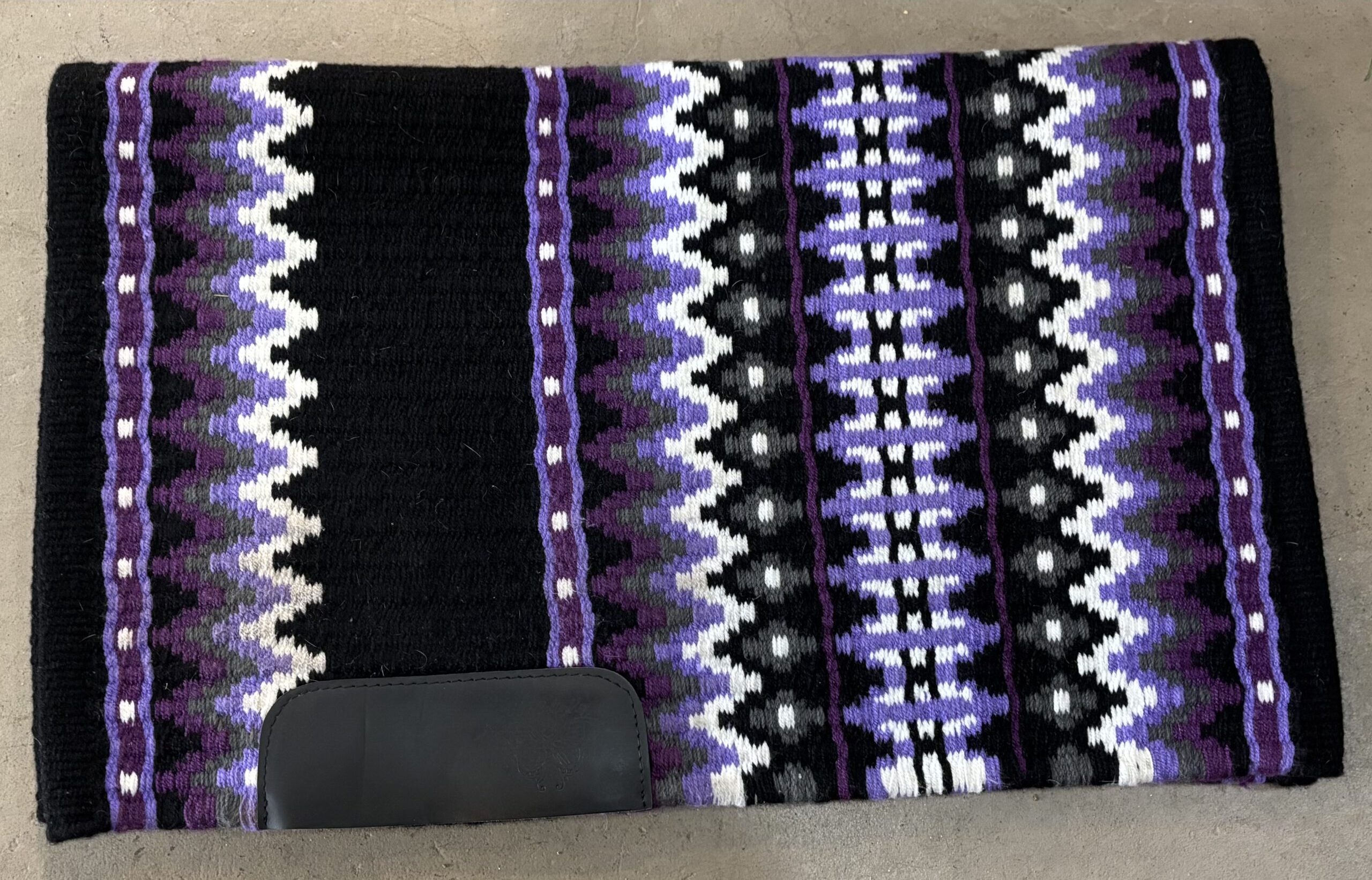 This western show pad measures to be 34″ by 42″ with a black leather guard to protect your pad from the fenders. This saddle pad features many different colors with multiple beautiful shades of purple, white, gray, and black.