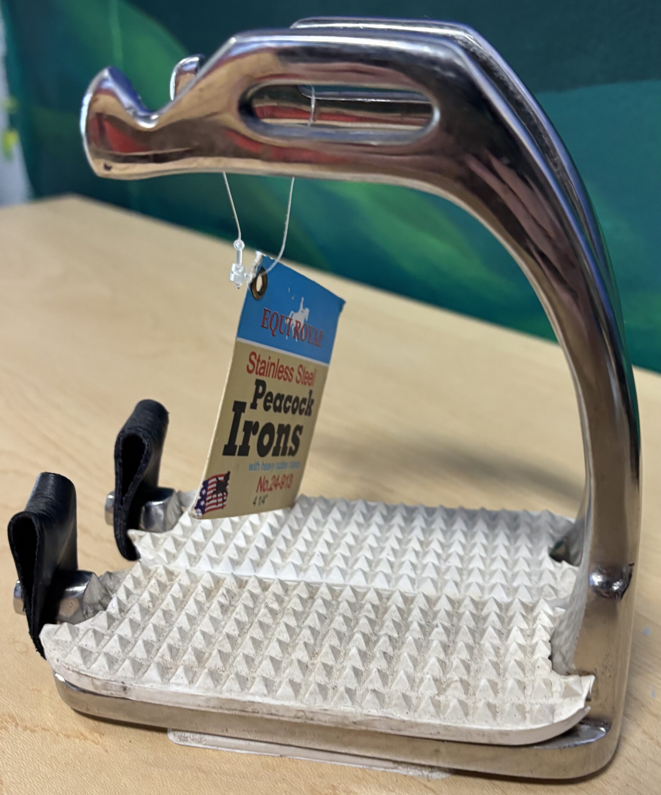 The foot bed of these stirrup irons measure 4.5″ and have white pads. These are also peacock safety stirrups that do not have rubber bands.
