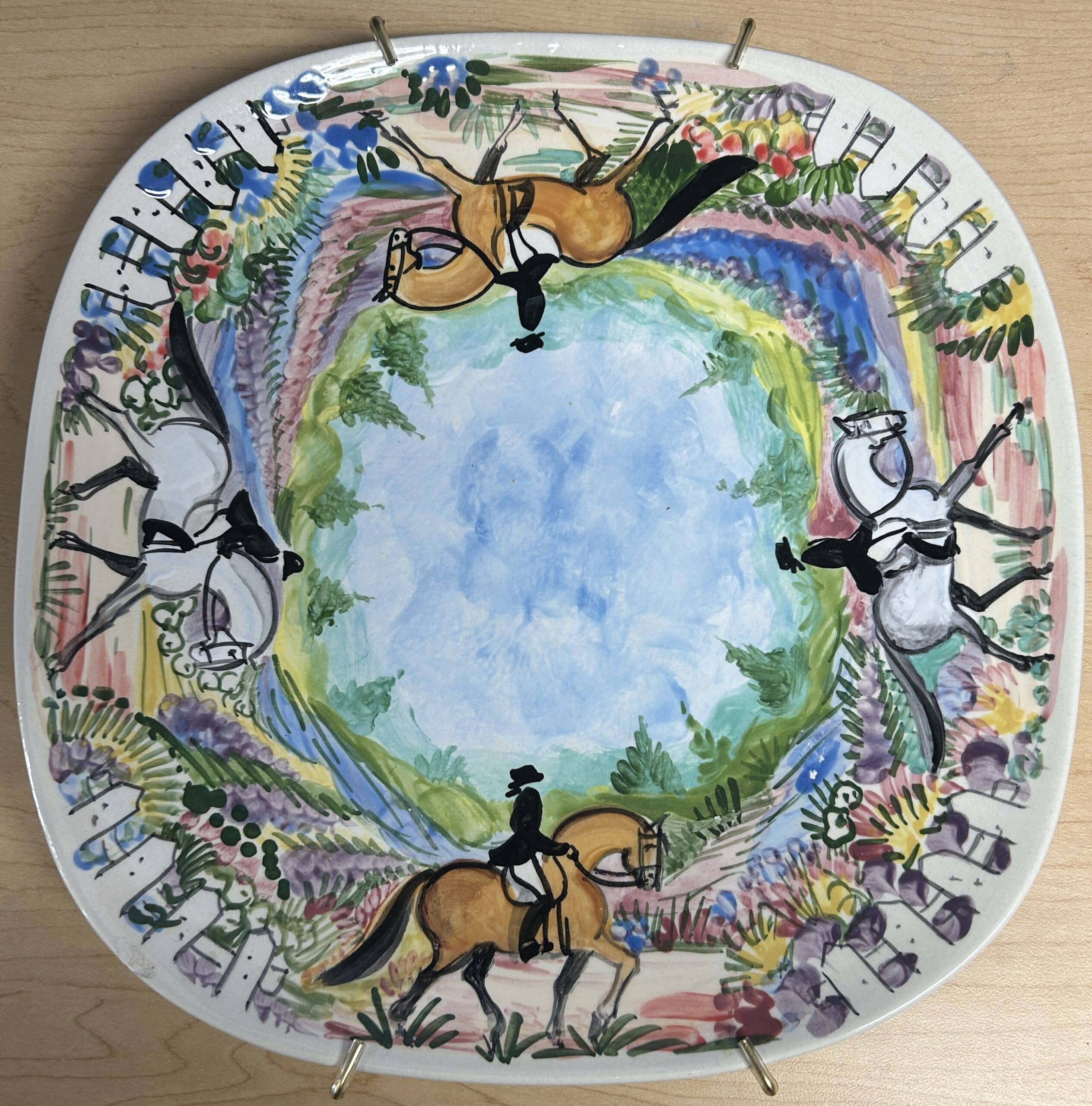 Stunning handpainted 11″ square plate featuring four Dressage horses under saddle. The back is signed by the artist.