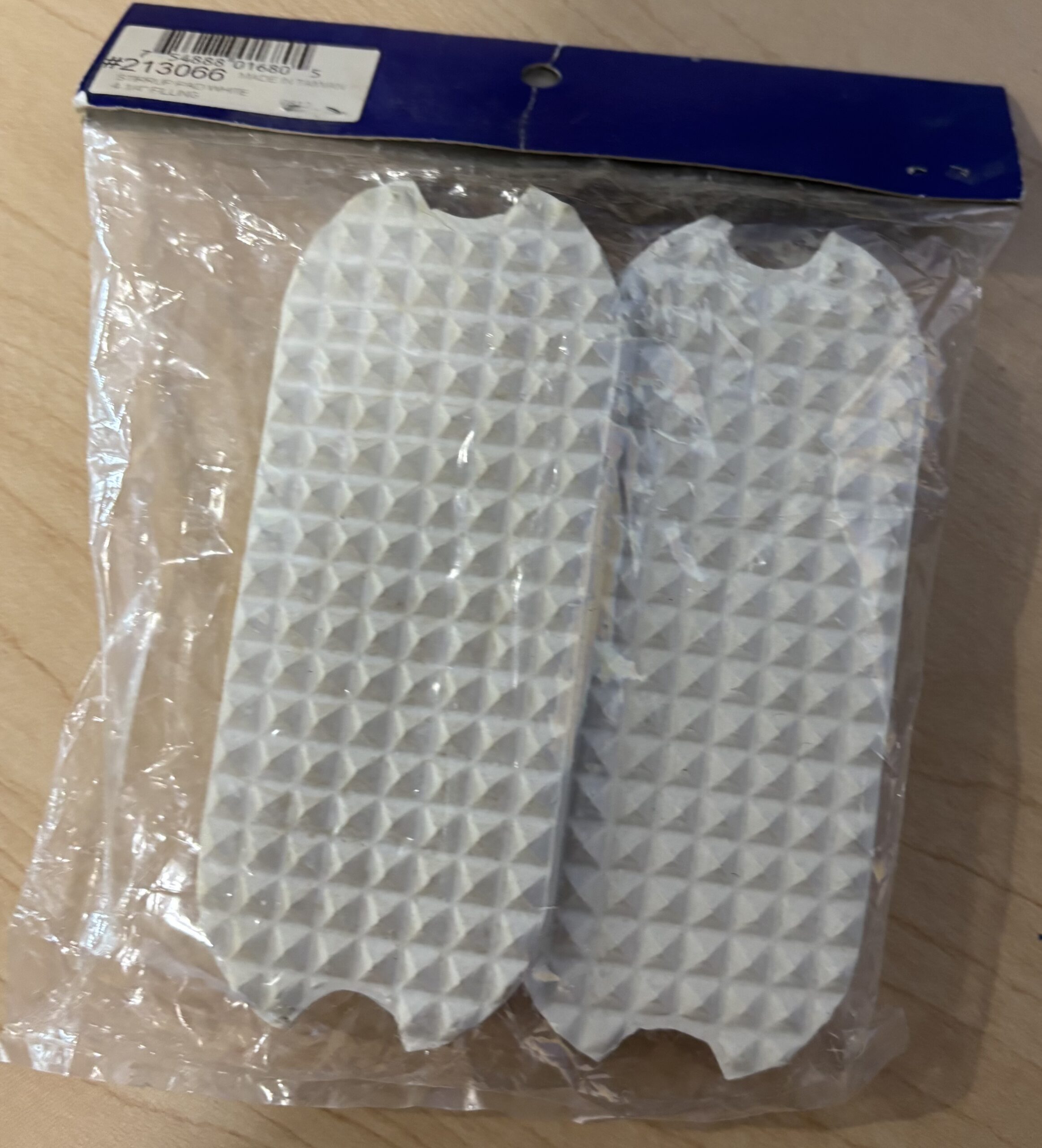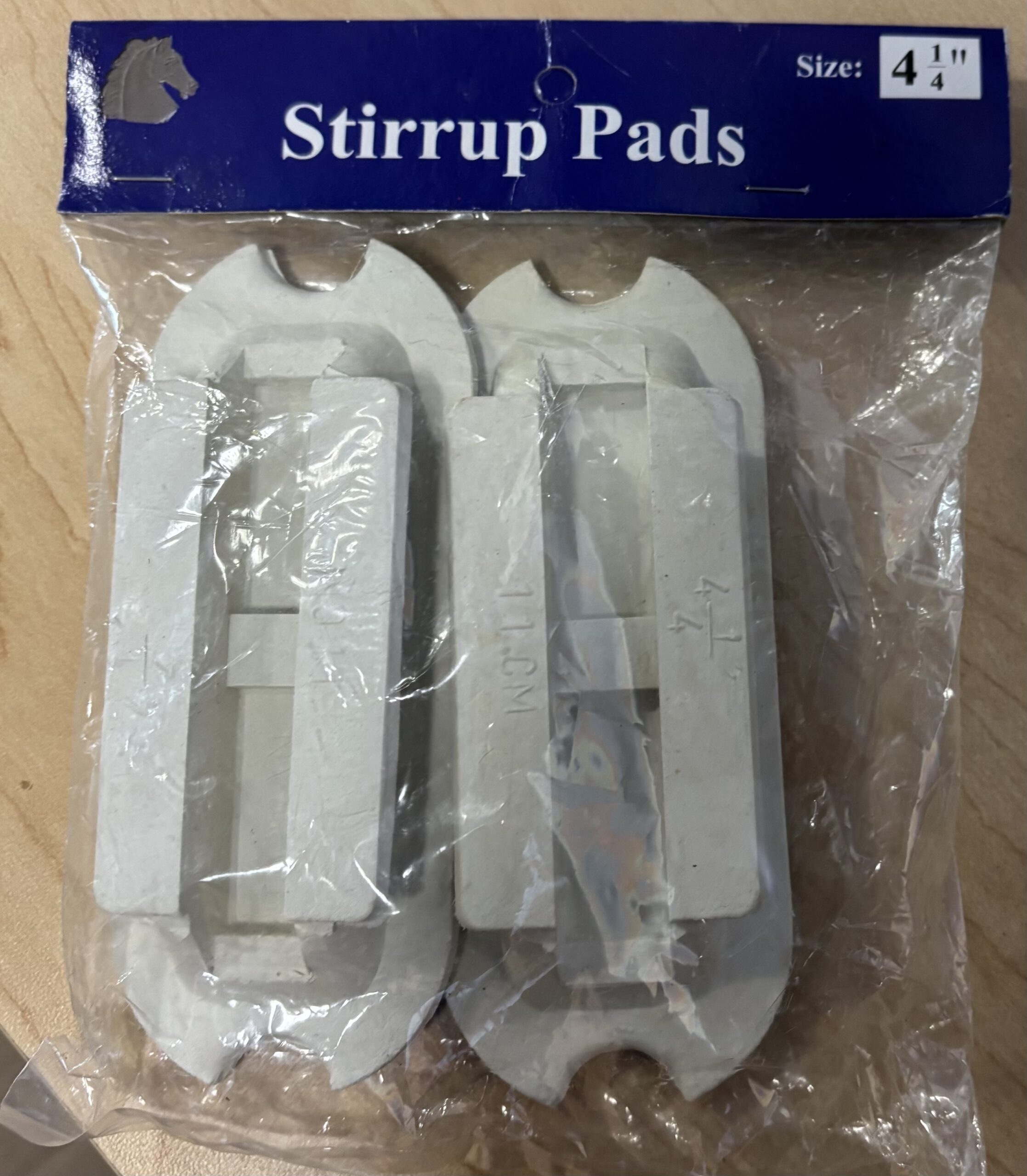 These stirrup pads are white and measure to be 4.25″ new in the packaging.