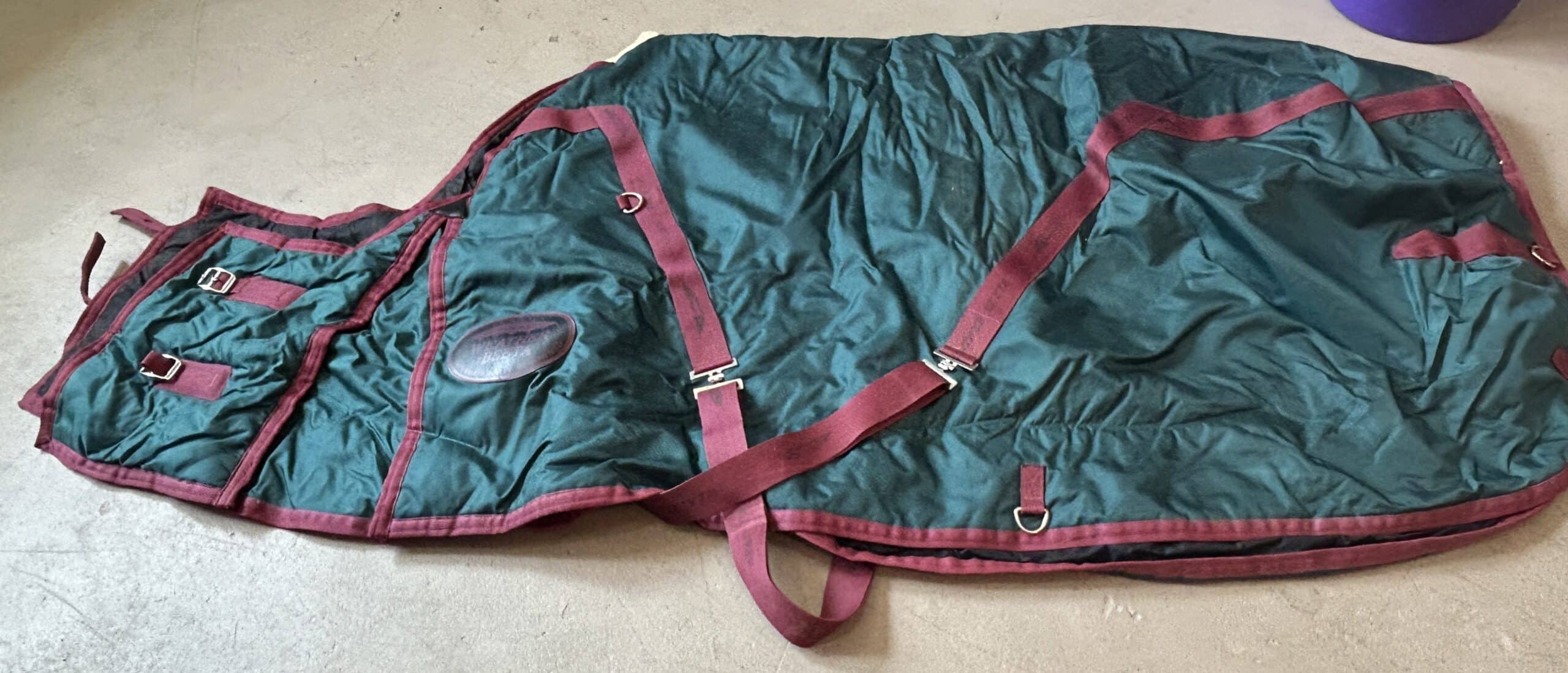 Mid to heavy weight stable blanket by Weatherbeeta lined with fleece. Buckle front and criss-crossed surcingle belly straps. No leg straps, but there are D-rings if you want them.