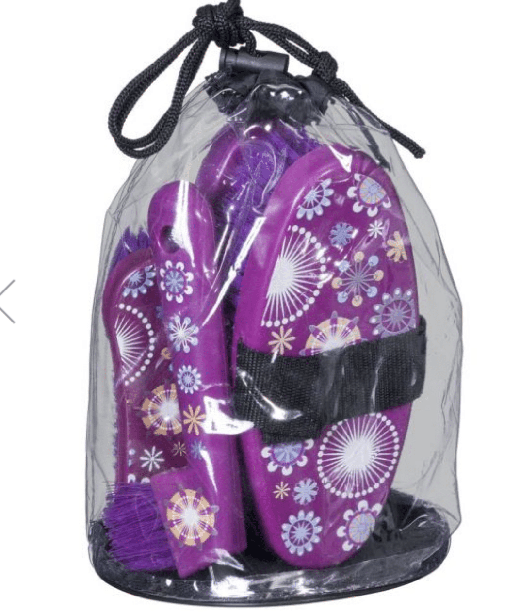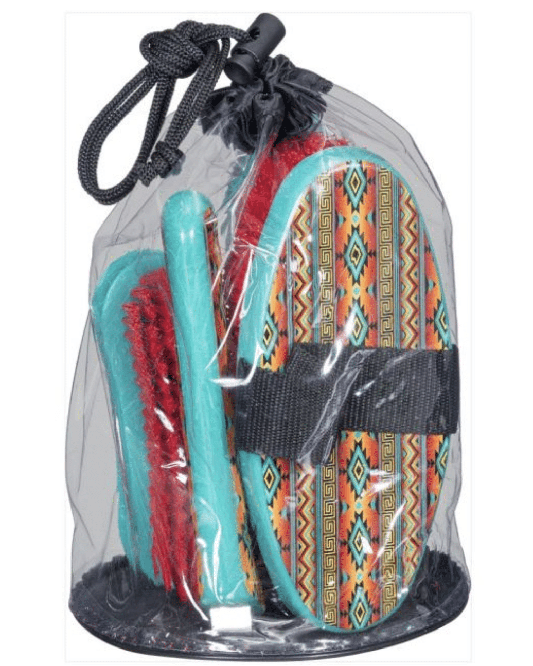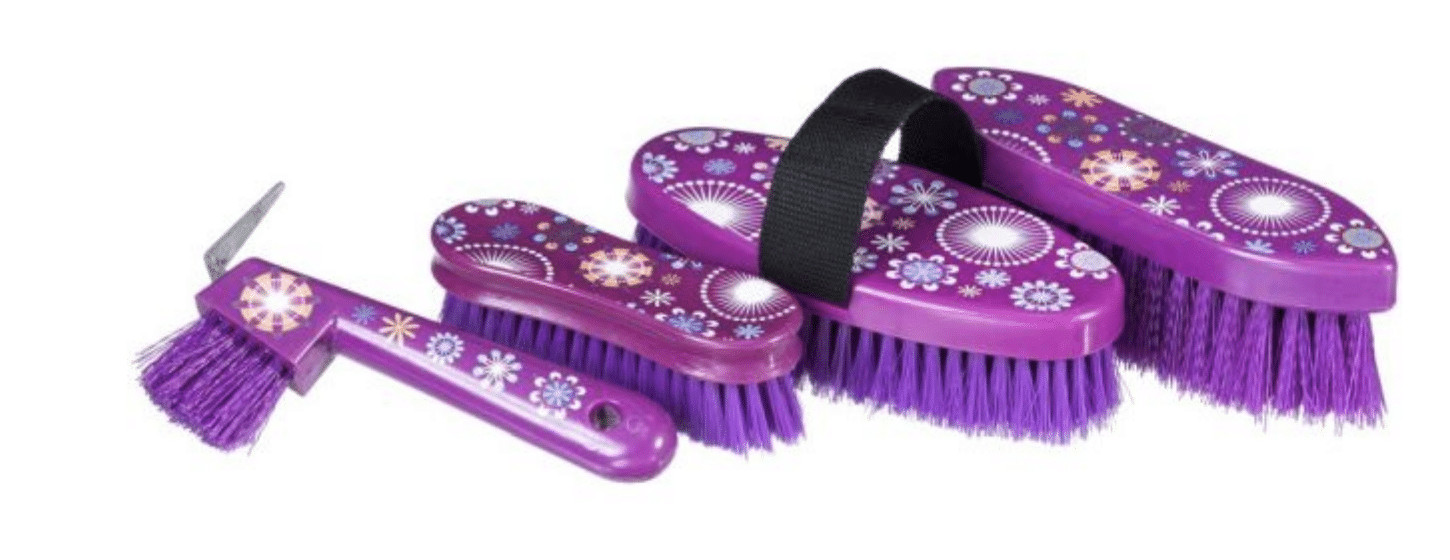 This is fun set of brushes with vibrant printed designs will set your brushes apart from your friends! The package includes a medium bristle body brush, oval dandy brush, soft face brush, and a hoof pick with brush, all within a little drawstring carrying bag!