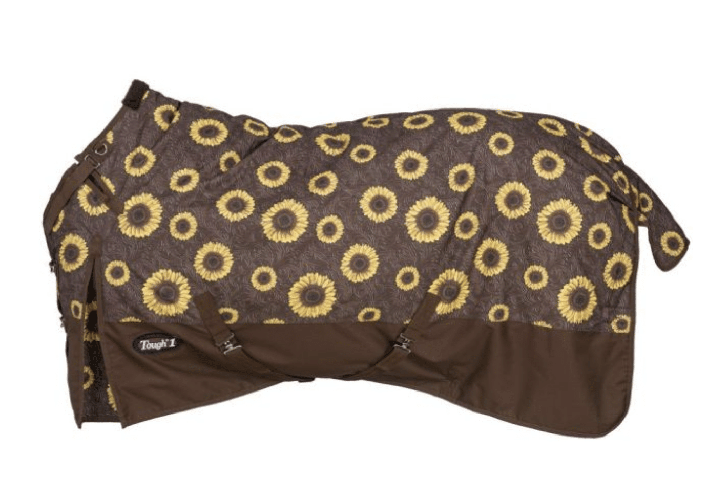 Bright, bold, and beautiful, your horse will look stunning in this sunflower print blanket! This blanket is made of a 1200 denier waterproof ripstop outer shell with 250 grams of poly fill for warmth. It is designed with a Tough1ยฎ Snuggitโข strap which offers a more adjustable fit around the neck. The large shoulder gussets allow the horse freedom of movement and three dee rings at the neck offer optional neck cover attachment. The double buckle front closure design includes removable snaps and a โQuick Gripโ tab for extra security. Other features include: fleece wither protection, tail flap, crossed surcingle straps with elastic ends, and adjustable/replaceable elastic leg straps.