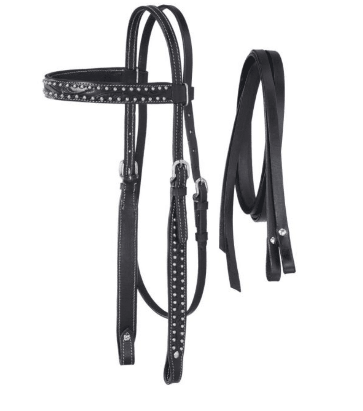 The Braden collection pony browband features floral hand tooled leather with silver dot accents and star conchos with matching reins. Adjustable buckles at both cheeks and throatlatch, Chicago screw bit ends.