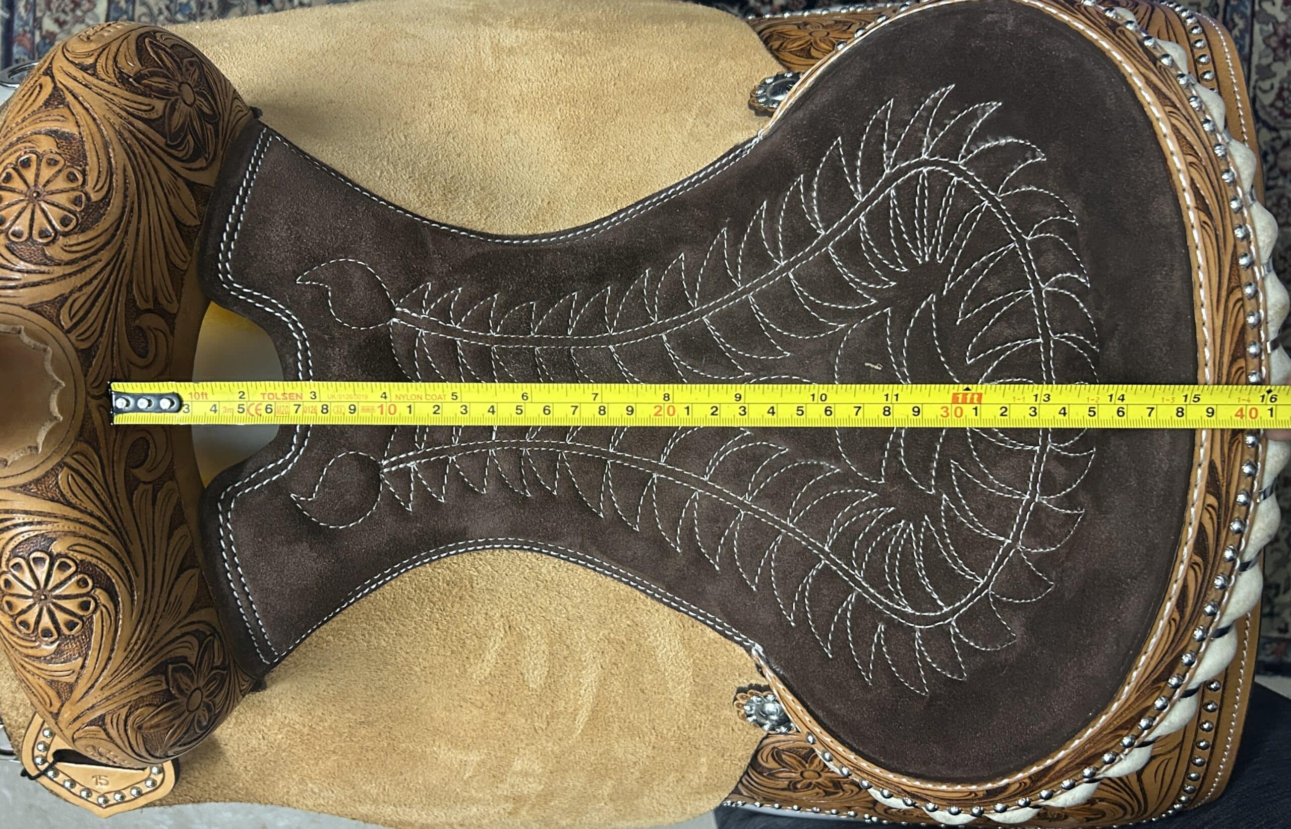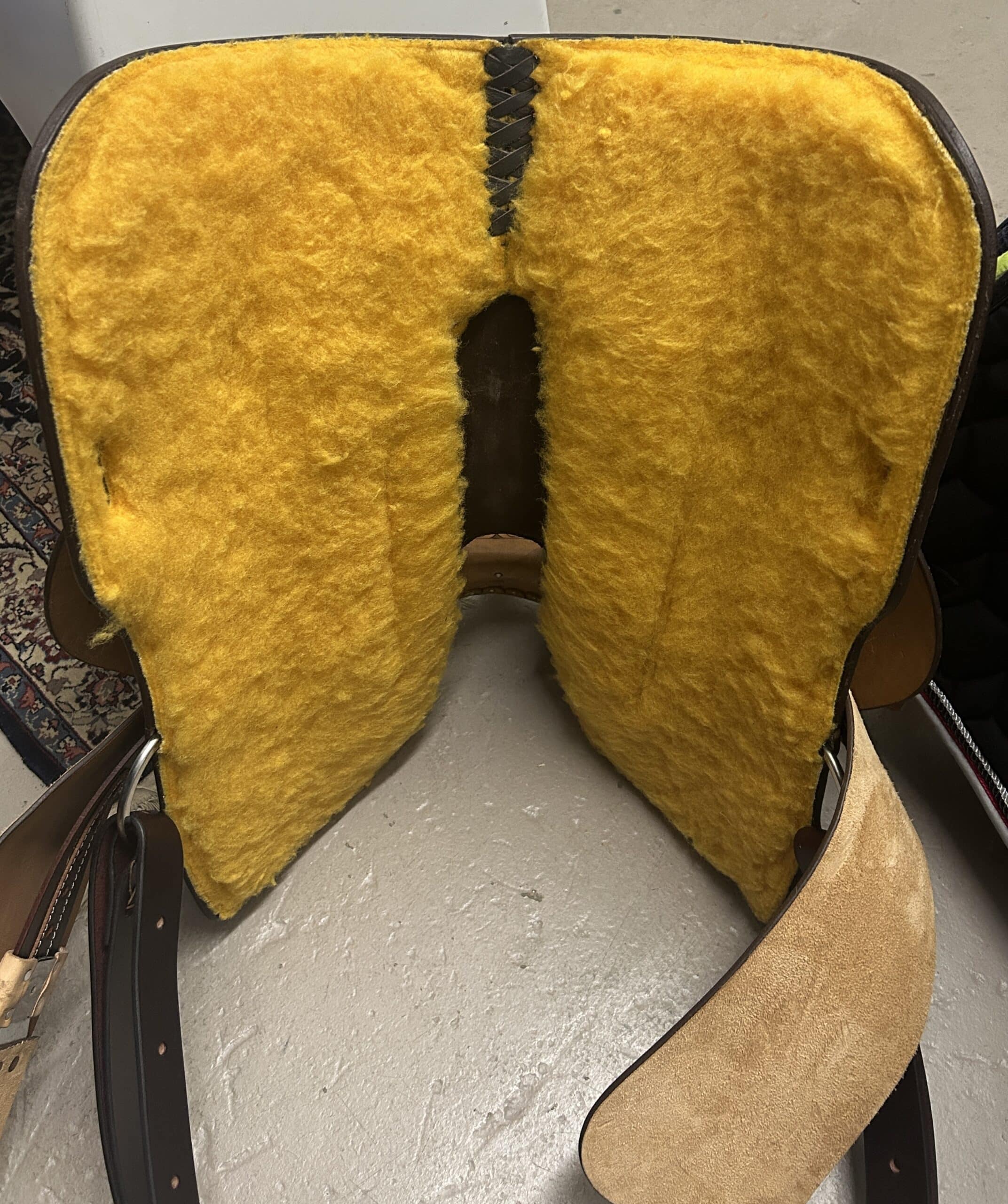 Lightweight barrel saddle with roughout seat, jockeys, and fenders.