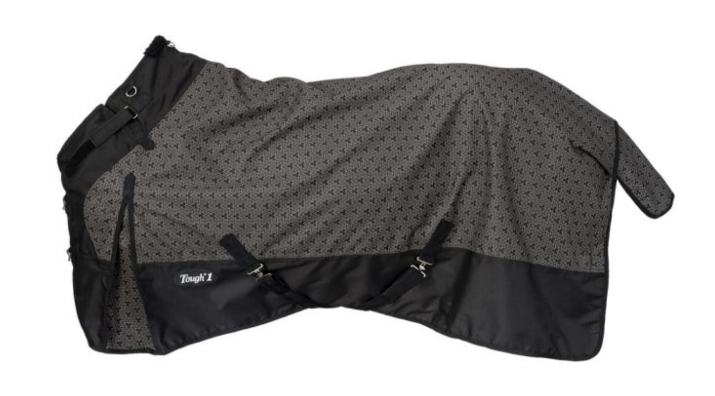 This striking printed sheet is both fashionable and functional! The 1200 denier ripstop outer shell has a reflective geometric design, lighting up when hit with direct light, making this sheet perfect for evening turnout. It features a Tough1® Snuggit™ strap which offers a more adjustable fit around the neck. The large shoulder gussets allow for freedom of movement and the three dee rings at the neck offer optional neck cover attachment. A double buckle front closure design includes removable snaps and a “Quick Grip” tab for extra security. Other features include: fleece wither protection, tail flap, crossed surcingle straps with elastic ends, and adjustable/replaceable elastic leg straps.