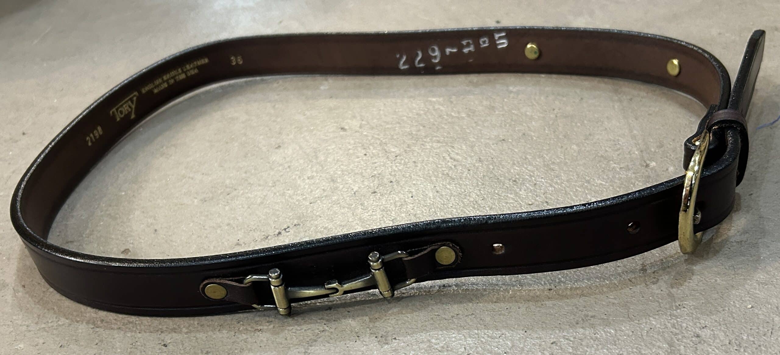 Reflect your equestrian style with this Tory Leather 1″ Snaffle Bit Belt with Brass Snaffle Bits & Buckle. Handcrafted in the USA from beautiful bridle leather, it is embellished with riveted snaffle bits and nicely finished with creased edges. Sewn buckle closure.