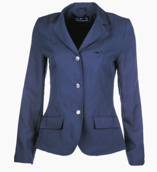 Beautiful lined show coat in dark blue, with 3 dark silver buttons and 2 pockets on front, 3 dark silver buttons on sleeves, and 1 left chest pocket inside.ย Padded shoulders and pleated for a sharp, professional look. Subtle embroidered dark blue HKM logo on chest.