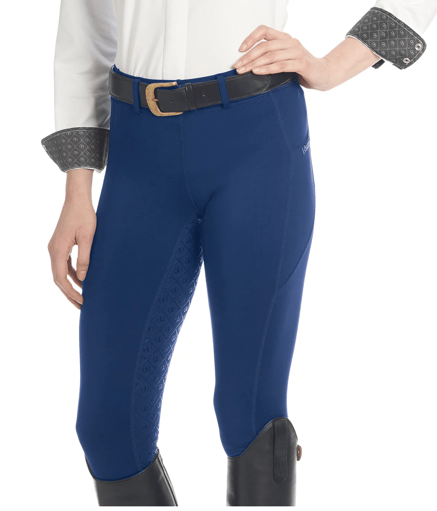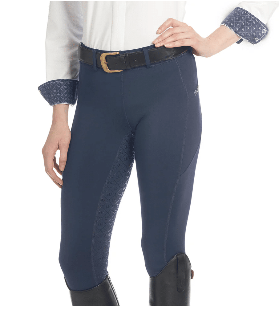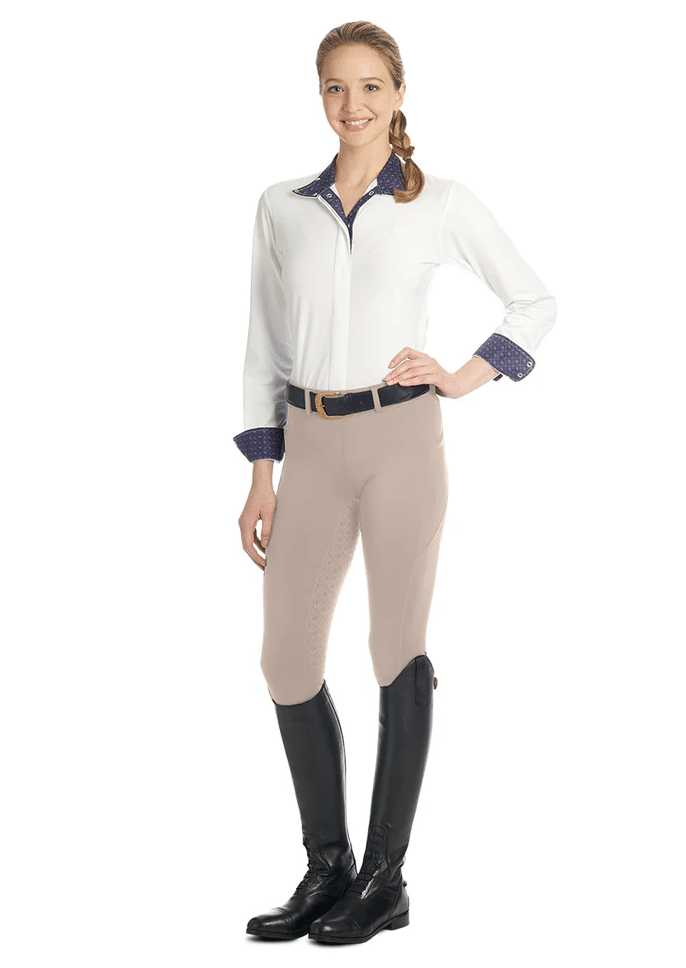 AEROWICK™ PULL ON DRESSAGE TIGHTS WITH GRIP-TEC™ SILICONE Our Aerowick™ tights will become your favorite daily wear! Super comfortable lightweight fabric with maximum stretch plus smoothing and supportive light compression combine to create the ultimate schooling tight. Handy side pockets are big enough to hold a phone and convenient enough to hold treats. PrimaUV™ provides UPF 30 protection against 96% of UVA, RepelTech™ keeps you looking clean by repelling hair and dirt, while being abrasion resistant, and FreshLock™ lends anti-microbial and odor-resistant properties. Material: AeroWick™ – smooth ultralight spun polyester spandex Fit: Classic- average shape to hip and thigh Rise: Mid– slightly below the navel (+/- 1”)Waistband: Regular 1 1/2” Front Pockets: Side positioned EZ-V Ankle Type: Shaped stretch spandex Full Seat: Grip-Tec™ silicone