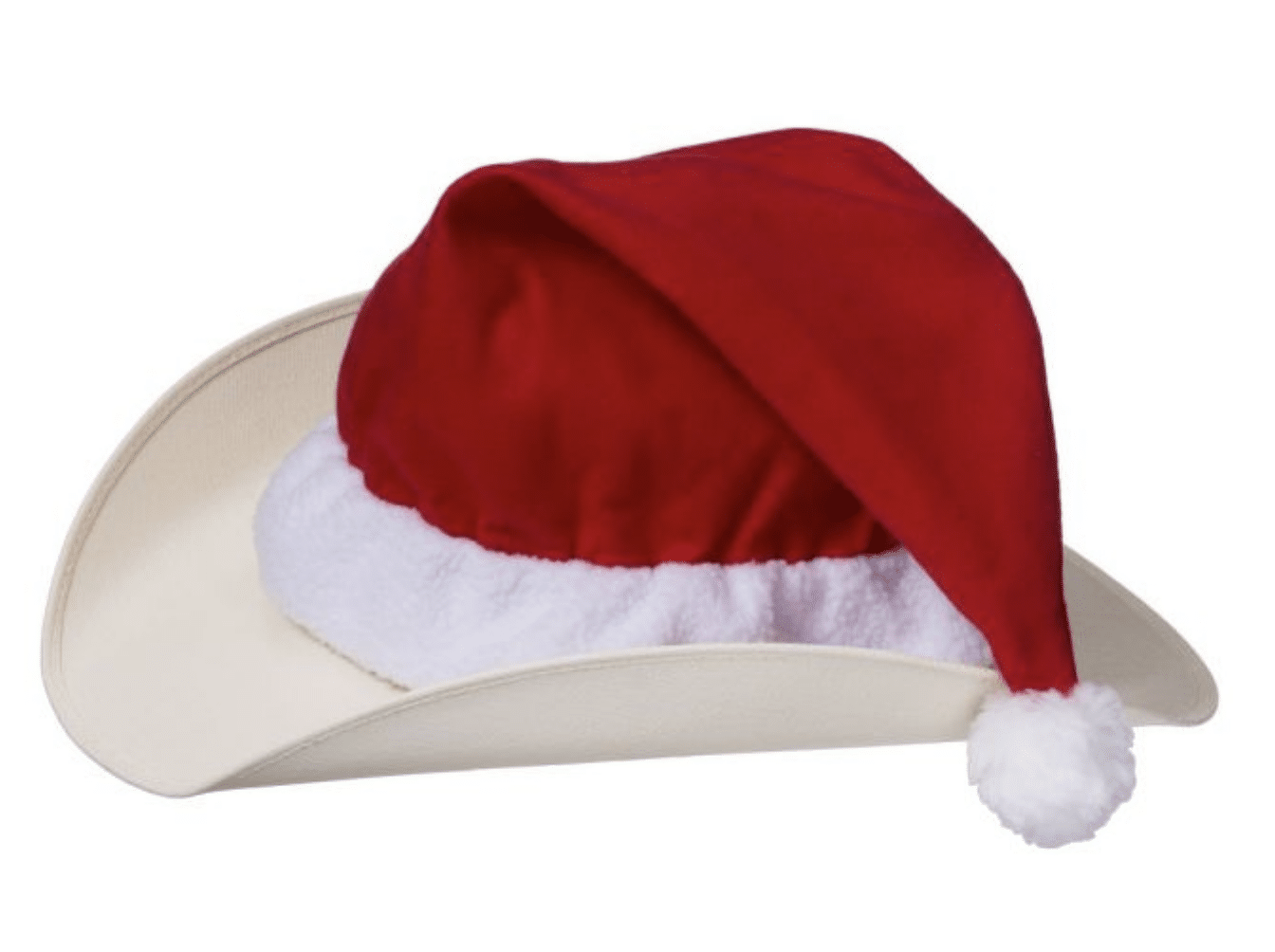 Ho, Ho, Ho Santa has arrived! This festive Santa hat cover is designed from quality felt that is decorated with plush white fleece trim. Complete with elastic bottom to fit most cowboy hats or riding helmets.