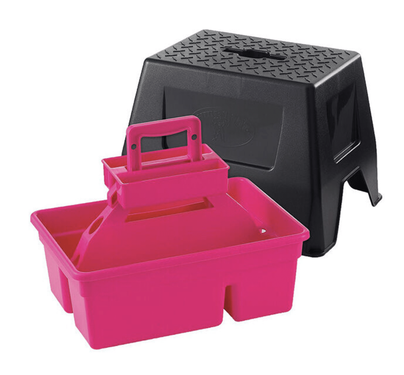 Step stool and tote box in one patented design! The sturdy tote holds supplies while the removable step stool fits over it to protect contents from the elements. Big enough to hold 12 inch-tall spray bottles yet easy to carry with one hand. Internal storage tray holds small items. The tote box has a retractable handle that protrudes through the step stool for carrying, and retracts flush with the top of the stool so you can sit or stand on it. When not retracted, the handle can be locked with a padlock (not included). The stool features a non-skid surface and holds up to 300 lbs. Ideal for horse grooming, painting, cleaning, gardening, many other uses. Measures 20 inch long by 16.125 inch wide by 14 inch high. Tote box and black stool made of heavy-duty, impact-resistant plastic (tote box available in a variety of colors). Patented.