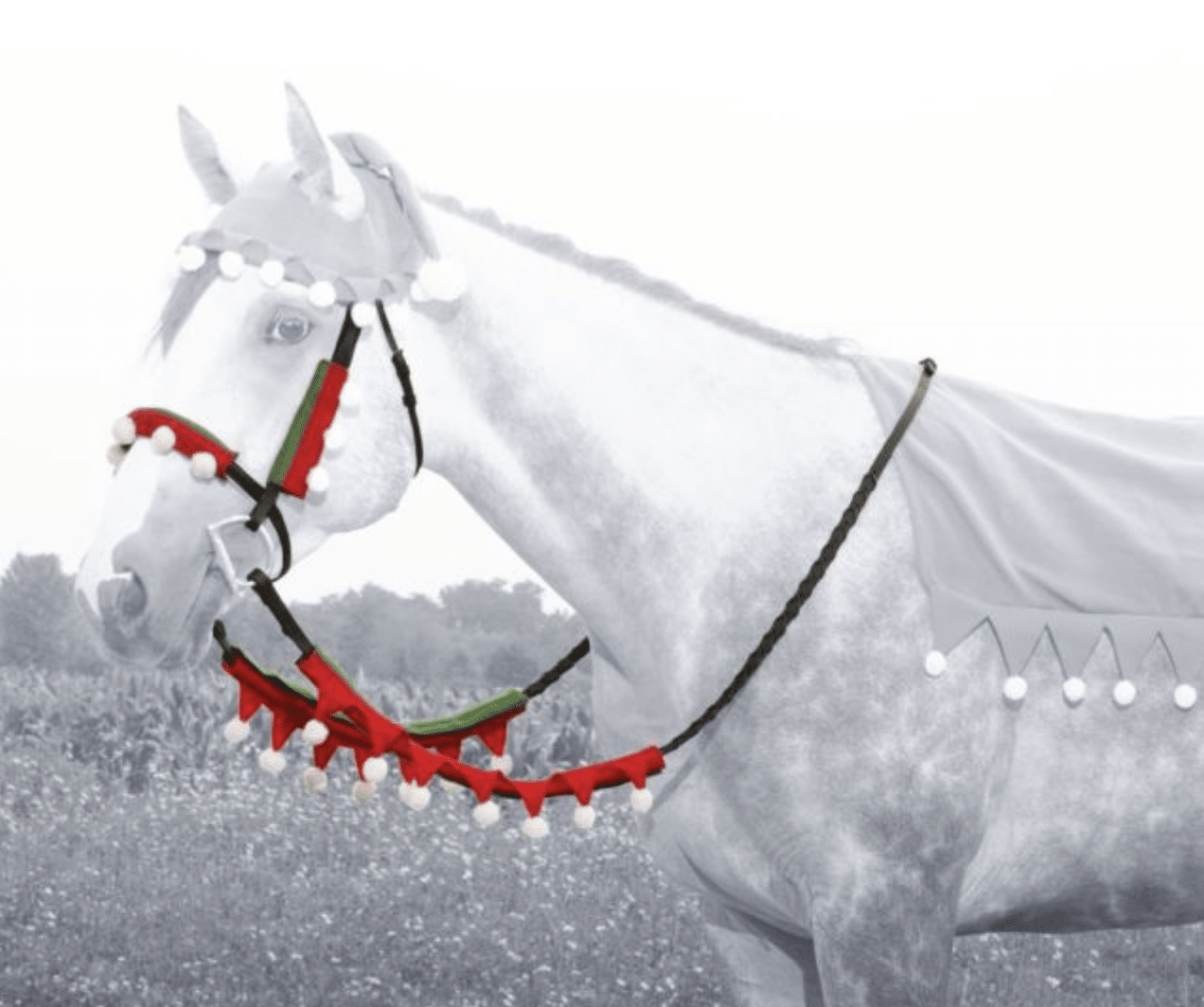 These Christmas-themed bridle and rein covers are surely to put you and your horse in the holiday spirit! The felt material features white fleece trim that is decorated with fun triangular tassels and white poms. Easy to attach with โQuick Gripโ closures. Perfect for parades, pony rides, fun shows, photoshoots, and more! Includes 2 cheek pieces, 1 nose piece, and 2 rein covers.