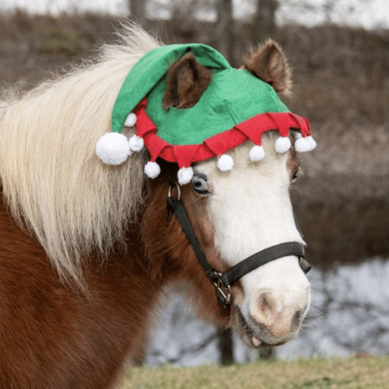 Get your horse into the holiday spirit with this jolly elf hat! Perfect for parades or holiday photos, this hat is made of quality green felt with red triangular tassels and white poms. The 2-ear design is easily secured onto a halter or bridle with 2 “Quick Grip” closures.